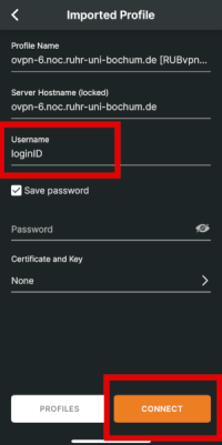 - Geben Sie als User ID Ihre LoginID und darunter das entsprechende Passwort ein. Tippen Sie auf den Schalter Connection um die OpenVPN-Verbindung zu starten und wieder zu trennen.